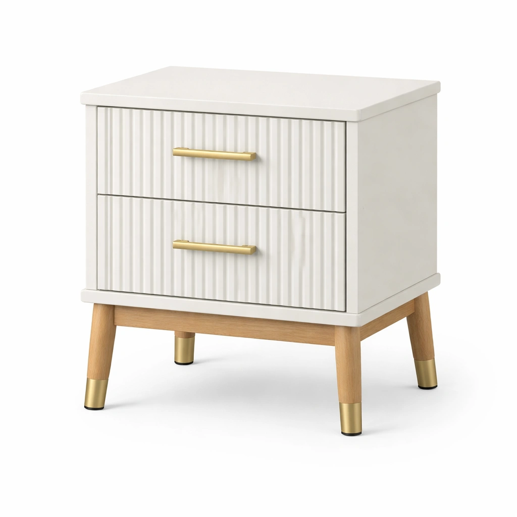 Mesita de noche de MDF blanco con patas de madera de roble y 2 cajones